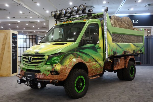 Kifelé menet a hallból megpillantok egy alig-alig felismerhető, emelt, mokányított, egyedi fényezésű Mercedes Sprintert, szénabálákkal a hátulján, szúrófényekkel az elején. Egy ilyennel azért még én is lehet hogy elmennék teherautósofőrnek. Mondjuk Kanadába...