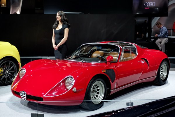 Kicsit elkalandoztam, vissza a szalonra. Az Alfa-stand hatalmas, a márka épp zubogva ünnepli a visszatérést. Giuliákkal tömve a placc, oldalt egy mai 8C és egy hatvanas évekbeli 33-as versenyautó ácsorog.