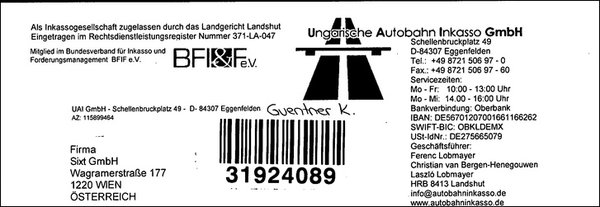 Így lesz a korábban elég szelíd pótdíjból csinos, osztrák szabad szemmel is jól látható 149 euró 72 centes tartozás. Ez napi középárfolyamon számolva 46 280 forint, vagyis az eredeti összeg nagyjából háromszorosa. Amikor ez így összeállt bennem, először arra voltam kíváncsi, hogy ki kér több pénzt a behajtásért, mint amennyi maga a pótdíj. A Gábornak küldött felszólítások fejlécében egy bizonyos Ungarische Autobahn Inkasso Gmbh (UAI) nevű németországi székhelyű cég neve szerepel. A cégnek van rendes honlapja, ott telefonszáma, e-mail címe is, sőt aki személyesen reklamálna, megteheti a németországi Eggenfeldenben, amely valószínűleg nem esik útba Gábornak, ugyanis 409 kilométerre található Mosonmagyaróvártól.