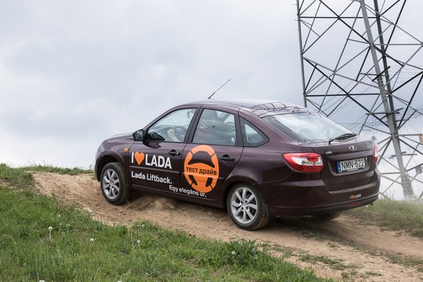 A Hungaroring Tanpályáján nemcsak terep van, hanem közúti képzésekre szolgáló, klasszikus vezetéstechnikai pálya is, és ha már ott jártunk, kipróbáltuk azt is, hogyan működik a Granta stabilizáló elektronikája. Csodákra nem lehet számítani a rántópados műanyag pályán nyári gumikkal, ugyanúgy ellenkormányoznia kell a vezetőnek, amikor a hátsó tengelyt a gép megrántja oldalra, de az látszik, hogy jól reagál az elektronika. Az eredmény: a stabilizálás valóban működik a Grantában, de ha nincs tapadás, ez sem képes csodára.