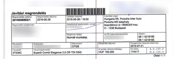 Amikor Zsuzsa május 26-án kötelező szervizre, átnézésre és műszaki vizsgára vitte a 2010-es évjáratú Skoda Superbet a Porsche M5-höz, arra számított, hogy a számára hibátlannak tűnő autó karbantartása nem lesz drága. Tévedett, mert jóllehet a nekünk elküldött Javítási megrendelőlapon 150 ezer forintos várható költségről írnak, végül háromezer forint híján 500 ezret hagyott a kasszánál két nappal később.