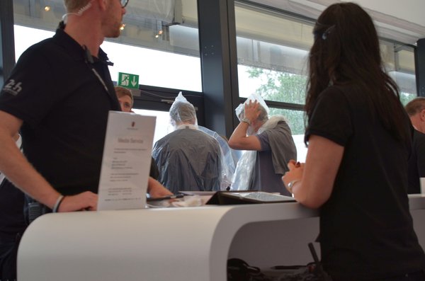 Egy kis belterjesség a reggelről. A képen nagyjából minden, amivel kihúzható egy 24 órás Le Mans-ban. A Porsche médiaközponjában ennyi idő alatt elfogyasztható cafetéria persze nincs rajta, de a kaján túl ezekkel itt ki lehet bírni terepen. Az ott balra fent a naptej. Eddig nem úgy néz ki, hogy szükség lesz rá, a laptop jobb alsó sarkán lévő esőköpényre talán inkább. A tegnap délutáni versenyzői parádéba is belerondított az eső, és eddig a szombat is felhős. Van pár sötétebb pamacs az égen, de a paddock környékén még nem esik.