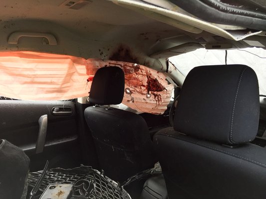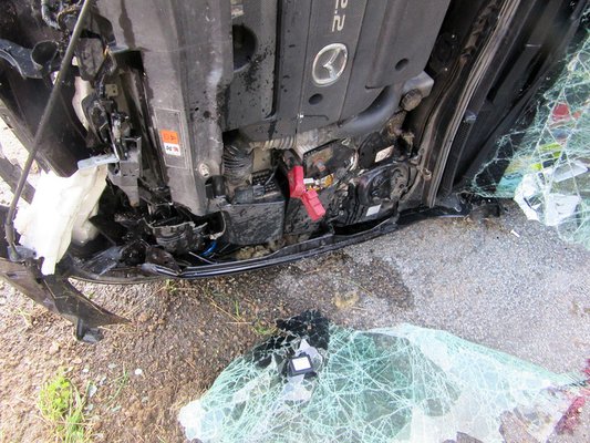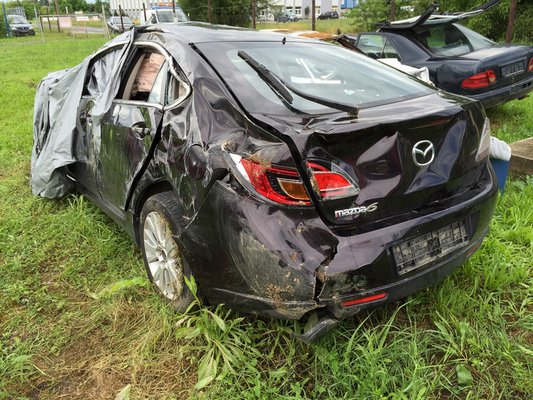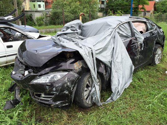 A képek alapján gazdasági totálkáros a Mazda, vagyis a baleset előtti piaci értékéhez képest gazdaságosan nem javítható. A két jobb oldali ajtó kivételével nincs egyetlen ép eleme sem az autónak, beleértve a tetőt is, amely megroppant a borulás közben, és javítása önmagában is rendkívül drága.