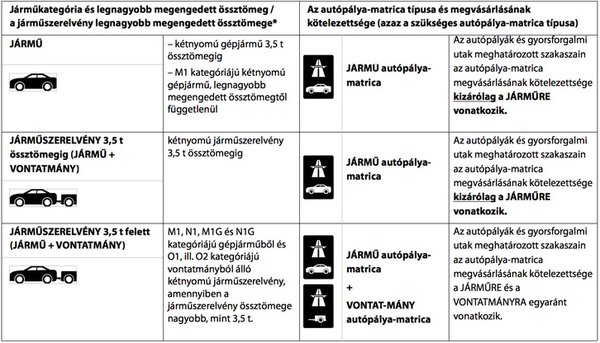 Az elektronikus autópálya-matrica vásárlási kötelezettség áttekintő táblázata, gépjárműtípustól függően.