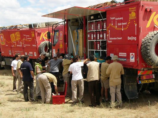 Ekkor következett a Renault-csapat nagy mutatványa. A vörös kamionok nagy négyszögben álltak fel, körülvéve egy jókora udvarnyi területet. Perceken belül működött a generátor, folyt az egyik kocsi oldalánál a tábori zuhanyból a víz, a konyha felől ínycsiklandó illatokat hozott a szél, a középen felállított pulton pedig már mérték is papírpoharakba a jéghideg sört. Vacsora után mindenki kapott egy kis kupolasátrat, ott állíthatta fel a végtelenbe nyúló tájon a csillagok alatt, ahol jól esett neki. Ha a sánta lábával kilométerek százain, nélkülözések és veszedelmek között gyalogló Vámbéry ezt látná.