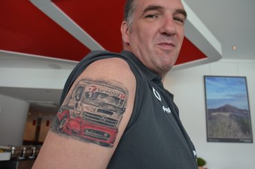 Majdnem kimaradt: ő itt Markus Bauer, a Tankpool csapatfőnöke, az pedig ott egy igazi tattoo, amit a nogarói győzelem után varratott.