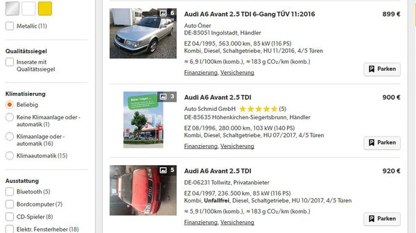 A kiszemelt 2,5 literes TDI-k ára nagyon érdekesen alakul. A csekélyke kínálat alja nem jöhet szóba, mert nincs érvényes műszaki vizsgája és/vagy környezetvédelmi vizsgája. Ezt többféleképpen is jelzik a hirdetők. Leírják a HU (Haubtuntersuchung - fővizsgálat, egyszerűbben műszaki vizsga), illetve AU (Abgasuntersuchung - környezetvédelmi vizsgálat), akár évekkel ezelőtti lejárati dátumát, vagyis ezeket nem tüntetik fel, de a szövegben szerepel egy mondat, mely szerint az autó nem menetkész (nicht fahrtauglich), vagy es hat keine TÜV.