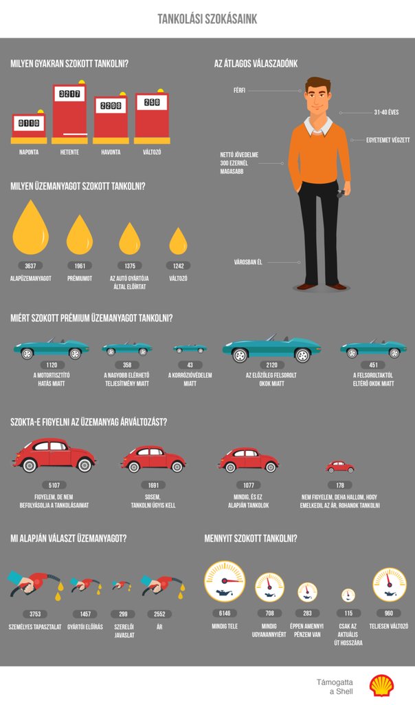 Ha már meg kellett állni tankolni, a megkérdezettek háromnegyede tele is teszi a kocsit, alig van olyan, aki csak az aktuális távra tankol. A kérdőívet kitöltőknek csaknem a fele személyes tapasztalatok alapján választ üzemanyagot, a legtöbben, a megkérdezettek 37%-a, alapüzemanyagot tankol, míg 23 százalékuk a prémium üzemanyag pisztolyáért ért nyúl a kúton . Utóbbit 27 százalék kifejezetten a motortisztító hatása miatt választja, 51 százalék pedig a prémium üzemanyagok pozitív hatásainak összessége miatt. A prémium üzemanyagot vásárlók 87 százaléka személyes tapasztalatai miatt veszi ezt.