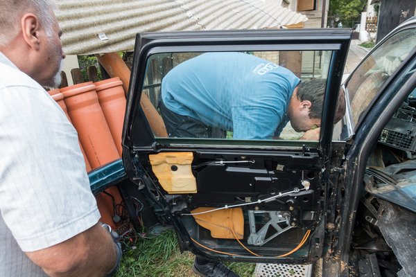 Miután kitapasztaltuk, hogy az apró alkatrész törékeny, a műhellyel szomszédos büfében megebédeltünk. Némiképp eltávolodva a problémától és a ténytől, hogy nincs a birtokunkban a profi megoldáshoz szükséges biszbasz, nekiláttam a hátsó ajtó cseréjének, hogy ügyetlenkedéssel tereljem el az átmenetileg szomorkás Laci figyelmét.