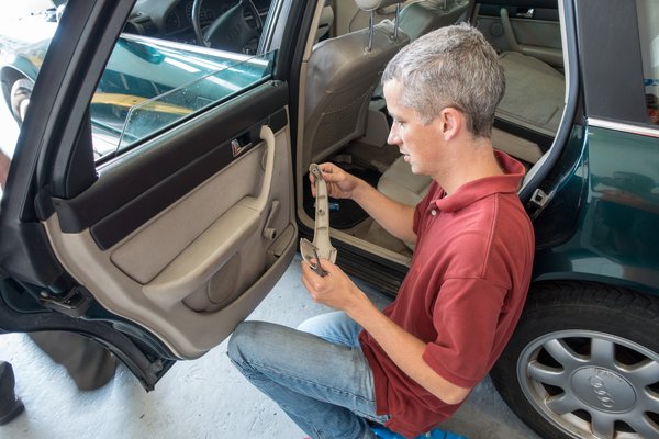 Nem tűnik embert próbáló kalandnak két ajtó leszerelése egy húszéves Audin. Most már tudom, hogy a valóság kicsit árnyaltabb, hiszen például a vezetőoldalon nemcsak mélyközép-sugárzó és egy különálló csipogó van a kárpitban, de ott az elektromos ablakemelő szerkezete, illetve a Webasto állófűtés kezelőpanelje is. Az ajtókárpitokat két kicsi, látható helyen lévő, illetve két nagyobb, a kapaszkodó alá rejtett, valamint egy harmadik, a belső kilincs alatt bujkáló kereszthornyos csavar tartja a megfelelő pozícióban, amúgy négy, masszív műanyagfülön lógnak.