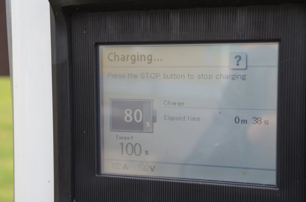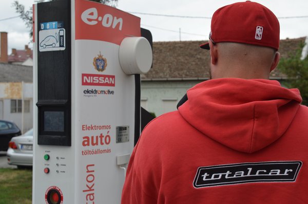 Mogyoróddal önmagában még nem értünk volna le, arra viszont elég volt az a pár ott beszedett plusz kWh, hogy nyugalommal autózzunk le Szolnokig 13-14 kWh/100 kilométeres átlagfogyasztással a fele részt autópályából, fele részt a 32-es útból álló szakaszon. Szolnokon egy kis belvárosi parkolóban van egy e-on-féle chademo. Igazi villanyautós Nirvána ez is: csak le kell akasztani a töltőfejet, végigpötyögni a tizenkét nyelven, de magyarul nem futó menüt, majd otthagyni az autót, hogy az ingyen árammal kapjunk újabb minimum nyolcvan százalékos töltöttséget. A szolnoki kút viszont nem is kényeskedett, közel száz százalékra tolta az akkumulátorokat: 154 kilométeres hatótávot írt a rendszer, mire megjártuk az ebédet.