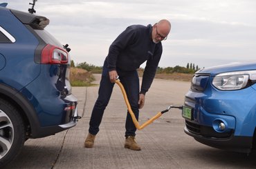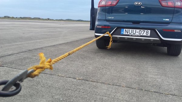 Hogy mennyire beszűkül a nem gyakorló villanyautós tudata, ha elhagyja a székmegyéjét, jól jelzi, hogy először komolyan már csak Kunmadarasnál jött elő a téma, hogy akkor mi vontatunk, vagy minket vontatnak majd a kötelekkel. A helyszín a korábban megadott kunmadarasi ex-katonai repülőtér. Kilométereket autóztunk a tégláig lecsupaszított laktanyaépületek, a kukoricaföldek és az üres hangárok között a kifutópályáig, ahol megkaptuk a cél után a feladatot is végre: három, nagyjából másfél kilométeres kör, a kísérő Niro után kötve. És ha lehet, a végére mutasson minimum öt kilométerrel nagyobb hatótávot a fedélzeti rendszer. Lényegében egy lejtőszimulálás, kolduskör, ha jobban tetszik.