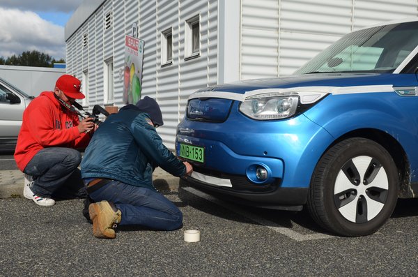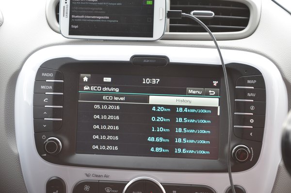 A győri parkolóban az előbb még 140 kilométeres hatótávot írt a fullra töltött akksikhoz a Kia. Beszédes, de akkor még bíztunk benne, hogy a tegnap esti izmosabb menetekből kalkulált a gép. Azóta kiértünk Győrből és úgy tűnik, a hideg a nagyobb baj: a hétfői 13-14 kWh-s fogyasztásunk felment 18 fölé. Jobb híján az első városon túli benzinkúton három bár fölé fújtuk a kerekeket, lekaptuk az antennát és leragasztottunk minden hézagot a Soul orrán.