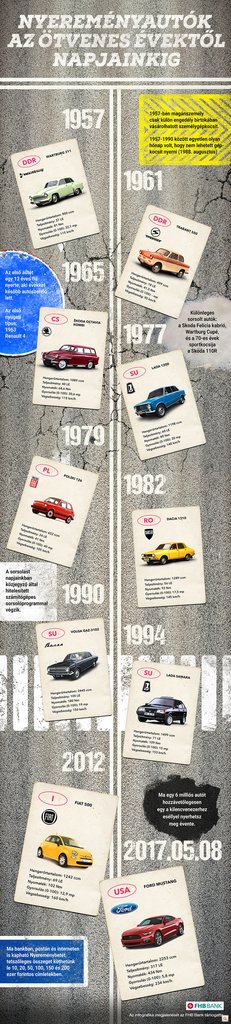 Az első magyar nyereményautó egy Wartburg 311-es volt, amit egy 13 éves fiú nyert a lottón. A csúcsidőszakban évi mintegy 1000 kocsi talált gazdára, köztük nyugati csodák, miközben a vásárlóknak éveket kellett várni egy Trabantra is. A nyereménybetét a mai napig népszerű Magyarországon, ami az olyan autókülönlegességeknek is köszönhető, mint a Wartburg Kupé, vagy épp az idén május 8-án megnyerhető Ford Mustang. Autók és érdekességek infografikánkon.