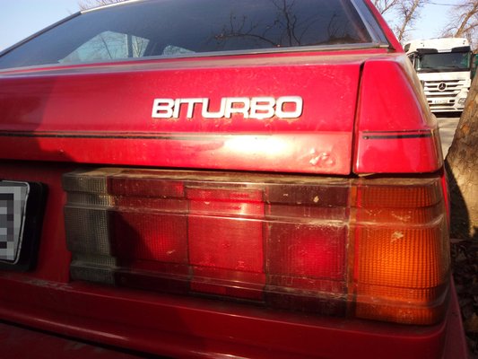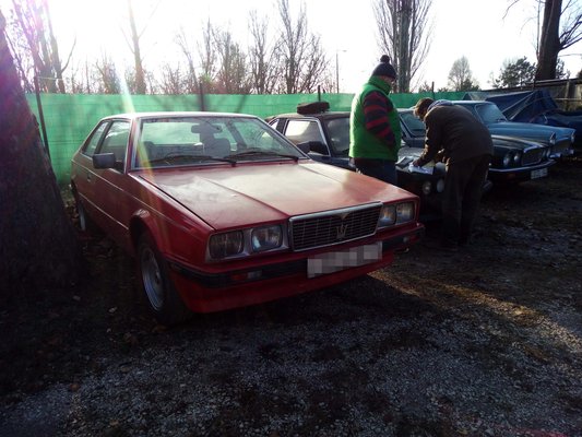 A Biturbót hirdető Barnával együtt megyünk be a telephelyre, ahol egy E21 Baur, egy Jaguar és egy Simca társaságában piroslik a Maserati. Már amennyire a jégcsapokkal díszített kocsi napszítta fényezésre még rá lehet fogni, hogy tud piroslani. Emberünk nem is foglalkozik mással, csak korosodó klasszikusokkal – egyszerűen ez teszi boldoggá. Most éppen kisöpörné a készletet, ezért rakta fel őket viszonylag olcsón a hahura. Közelebb lépünk az autóhoz, és megdöbbenünk. A bal első sárvédő gittből van, vagy csak nem sikerült az egyengetés, és a fényszórók körül is van egy kis rozsda, de közel sem tűnik olyan szánalmasnak a helyzet, mint amire számítottunk. Hátulról kapott, a balos lámpánál látszik, nem sikerült rendesen helyre rakni. De még az alját sem ette meg a korrózió, egyelőre jók vagyunk. A jobb oldalt nem látjuk, mert odáig elér az őrkutya lánca – ő sajnos nem a potenciális vásárlót, inkább az uzsonnát látja bennünk.