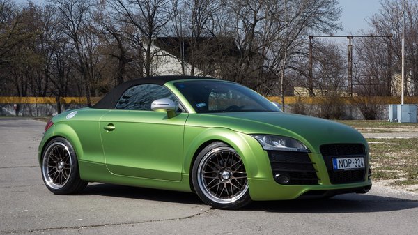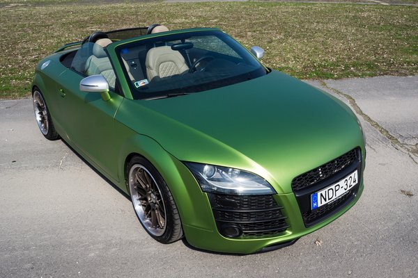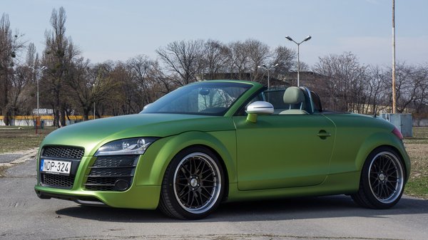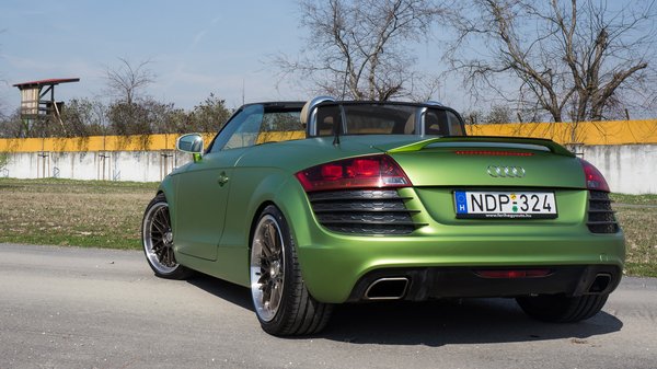 A gond nélkül eltávolítható zöld fólia felkerült a TT-hez való, Caraktere body kitre is, amely az R8 részletmegoldásait idézi az első és a hátsó lökhárítón, de tartozik hozzá diffúzor és hátsó szárny is. Az összes engedélyköteles tuning-alkatrészhez hasonlóan, ehhez a készlethez is német TÜV-bizonylat tartozik, vagyis odaát utcai használata engedélyezett. Az Audi összképe inkább csak a fóliázás színe miatt hivalkodó, a karosszériakiegészítők valamiféle fészlift-hatást keltenek.