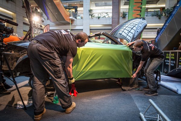 Balázs, a kiállítás szervezője reménykedik, hogy eltalálta a későbbi nyertes ízlését, amikor az eredetileg sötét metál karosszériára a Safex speciális, élénkzöld, selyemfényű fóliáját rendelte meg. A vadonatúj, steppelt bőrkárpitot is zöld cérnával varratta készre, szintén a helyszínen. Amikor először nyitottam ki a kis sportkocsi ajtaját, még nem tudtam, hogy tényleg nem fényezésről van szó, mert a fólia szabása és a felragasztás olyan precízen sikerült, hogy még az eldugott helyeken, sőt a hegesztések göröngyein is tökéletes a fedés.