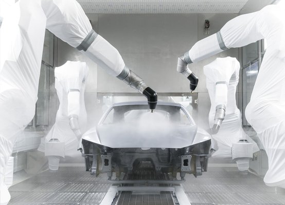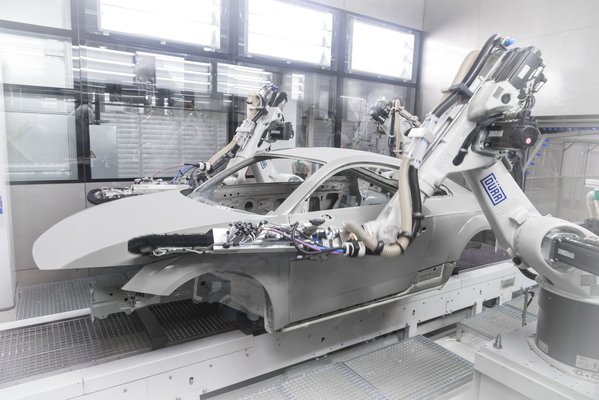 A tömített, füllerrel már lefújt karosszériákat robotok fújják, de előtte egy rafinált szerkezet pormentesít. Olyan robotokat kell elképzelni, melyek egy láncfűrészhez hasonlító kefével végigtörlik a karosszériát, de vannak itt más trükkök is: egy ionizációs portál elektrosztatikusan feltölti a karosszériát, és máris jobban vonzódnak a keféhez a porszemek, nedvesítik is a kefét és a porszemeket le is szívja róluk egy porszívó.
