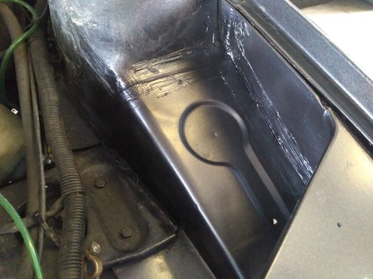 Amikor először láttam meg az újrafújt elemeket, kiszökött belőlem, hogy milyen szép lett. Aztán éppen Csaba rántott vissza a realitás talajára, és hozzátette, természetes fénynél látni az árnyalatnyi különbséget. Míg az autó alap-feketéje inkább szürkés, a frissen fényezett részekben egy leheletnyi lilát lehet felfedezni. Az összkép mondjuk így is sokat javult. A motortérben is volt dolga a fényezőnek: amikor a karosszériások újraépítették a sárvédő tartólemezét, szépen ki is tömítették, de nyilván ez sem maradhatott fémtiszta vagy alapozott, ott is kifújták feketével.