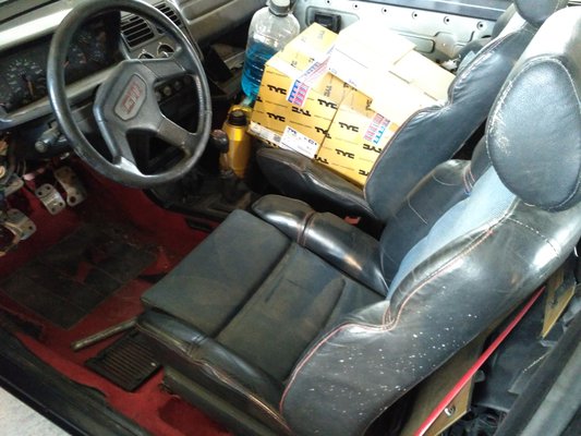 Most végre a gyári üléseket is a helyükön láthattam – bár egyelőre kicsit koszosan, az utasoldali mindenféle dobozokkal megrakva, de ott vannak. Sokkal jobban beleillenek ebbe a környezetbe, mint a régi, típusidegen Civic-ülések. Dolgozni azért ezeken is kellett egy kicsit, egy-egy kisebb hegesztést igényelt a szerkezetük, de még így is sokkal előrébb vagyunk, mintha szerkezet nélkül érkeztek volna, ahogyan eredetileg számítottunk.