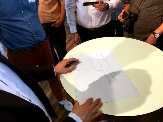 A tervezési folyamat úgy kezdődik, hogy a dizájnerek rajzolni, skiccelni kezdenek. A Porschénál és a szakma nagy részében még mindig papíron, és nem számítógépen. Ez az alapja mindennek, ezért vallja Péter, hogy a jó formatervező szépen is rajzol: hiába a legjobb formai ötlet, ha azt a tervező egy ügyes rajzzal nem tudja eladni a vezetőségnek. Ő maga az egyetem előtt aktokat rajzolt és a beszélgetés végén tart is egy kis bemutatót – persze nem meztelen testeket, hanem Porschékat vázol fel a lapokra olyan laza, bámulatba ejtő természetességgel, ami tényleg csak az igazán tehetséges emberek sajátja. Fél perc, pár vonal, és az üres lapon máris a 991-es sziluettje virít.