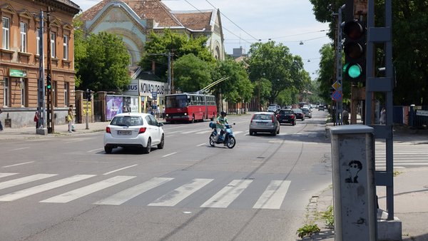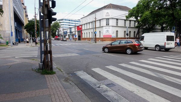 Ez egy úgynevezett telezöldes kereszteződés, és ahogy ácsorgok a sarkon, azt látom, hogy a magyar autósok képtelenek biztonságosan közlekedni egy ilyen bonyolult csomópontban. Amíg belátható mindkét sáv, folyamatosan megy a sor, de nem mindenkinek van szerencséje, ezért most, egy viszonylag csendes délelőtti órában is jön néhány olyan autó, amely csak az utolsó pillanatban tud befordulni a Kassák Lajos utcába.