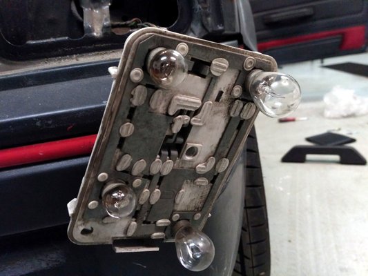 Eközben Márk végigment a lámpákon, hiszen műszakiról azok nélkül lendületből dobnak ki. Mert ugyan bekerültek a szép új fényszórók és irányjelzők, de fényt csak az egyikből tudtunk kicsiholni. Dokink mért egyet itt, mért egyet ott, aztán megállapította, hogy a jobb első lámpánál egy csokor testkábel okozta a hibát. Mármint azok hiánya. Hátul meg – milyen meglepő – a korrózió volt a ludas, ezért nem volt nekünk bal hátsó helyzetjelzőnk és féklámpánk. A felületek megtisztítása és némi forrasztás után már ez is rendben, világít és indexel is a Peugeot.