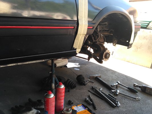 Mivel ezt korábban Sturcz Antival ketten szereltük, megkérdőjelezhető szakértelemmel, ezért kézenfekvő volt, hogy a Doki is ellenőrizze, minden rendben van-e. Sovány vigasz, hogy az összeszerelésnél nem rontottunk el semmit, így viszont lehetett tovább keresgélni. Végül meglett a diagnózis: ez a féltengely bizony 1-2 centivel hosszabb a kelleténél, így feszül, emiatt rázkódik terhelésen az autó. Zseniális! Hova fordulhattam volna máshova, mint megint a klubhoz: érkezett is a válasz, a GTI jobbos, tehát hosszabb féltengelye 845 milliméter. Hohó, hát itt a hiba, a miénk nem ekkora.