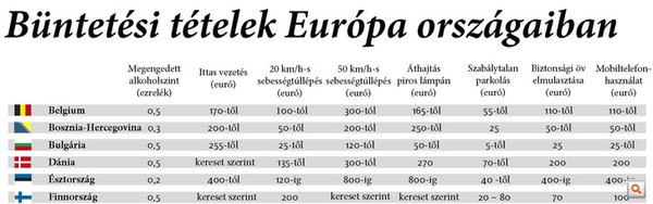 Annál is inkább, hiszen a gyorshajtási bírságok tekintetében elég nagy a szórás. Míg egy 20 km/h-s túllépést Ausztriában 30 euró környékén megúszunk, addig Franciaországban 135, Olaszországban 170 euróról indulhat a történet. Ha egy piros lámpát hagyunk figyelmen kívül, Ausztriában 70 eurótól fölfelé számolhatunk, a horvátok akár 270 euróra is megvághatnak. Az öv bekötésének elmulasztása a lengyeleknél a legolcsóbb, 20 euró, de a briteknél 570 eurónyi összegbe is beleszaladhatunk. Az ittas vezetést mindenhol elég vaskos számlával díjazzák. Csehországban, Szlovákiában és Romániában hozzánk hasonlóan zéró-tolerancia van, más országokban jellemzően 0,5 ezrelékes a küszöb.
