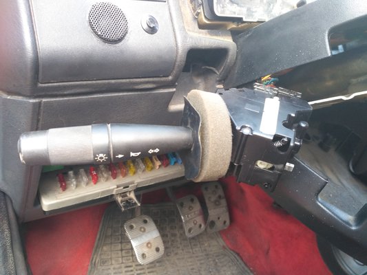 Aztán jött a szombat, és a panelek között, a telepi parkolóban nekiláttam. Érzésre olyan hetvennégy fok lehetett a kocsiban, amikor beültem, és elkezdtem bontani a műanyagokat. Van ugyanis egy másik bajuszkapcsolóm, az volt eddig benne, nem is emlékszem, melyik funkciója nem ment, de valami baja biztosan volt. Az irányjelző működött. Gondoltam, nem veszítek semmit vele, ha kipróbálom, legalább kiszűröm, hogy itt kell-e keresni a bajt. Mivel az elakadásjelző hibátlan, így a villogórelét kizártam, a biztosítékokat végignéztem, a testkábeleket a Doki gatyába rázta. Egyértelműnek tűnt a kapcsoló hibája.