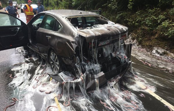 Nehéz gusztustalanabb emberi sérülés nélkül végződő autóbalesetet elképzelni annál, mint ami a U.S. 101-es országúton történt tegnap Oregonban: egy kamion terített be több autót angolnás nyálkatengerrel egy kisebb tömegbalesetben. Aki nem tudná, ennek az amúgy sem vonzó vízi állatnak erősen fejlett képessége a nyálkatermelés, amivel védi magát többek közt a kiszáradástól. Ezt tapasztalta közelről mindenki, miután a nyakába kapott pár hektoliternyit belőlük ebben a balesetben.