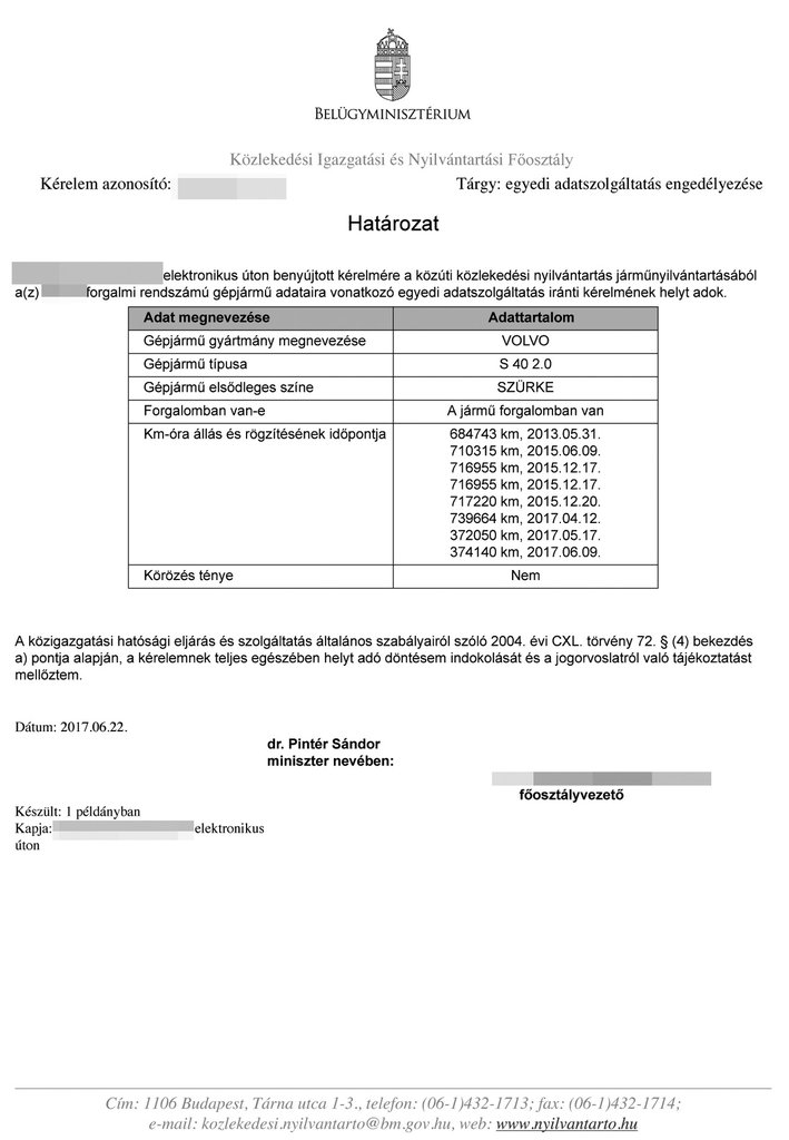 A vevő hajthatatlan volt, vitte az autót, László pedig letette a gondot, és nagyon csodálkozott, hiszen már csak másfél hónap volt hátra a következő műszaki vizsgáig, amelyen a meglévő hibáival sem mehetett volna át az autó. De átment, ami akkor vált biztossá, amikor két hónnapal az eladás után László elindított egy lekérdezést a Magyarország.hu-n, vagyis a portálon, ahol 625 forintért hozzáférhetőek az itteni autók fontosabb adatai. Csak arra volt kíváncsi, hogy kivonták-e végleg a forgalomból az S40-est, de arra nem számított, hogy egyrészt májusban leműszakiztatták, másrészt ott 372 ezer kilométer került a rendszerbe.