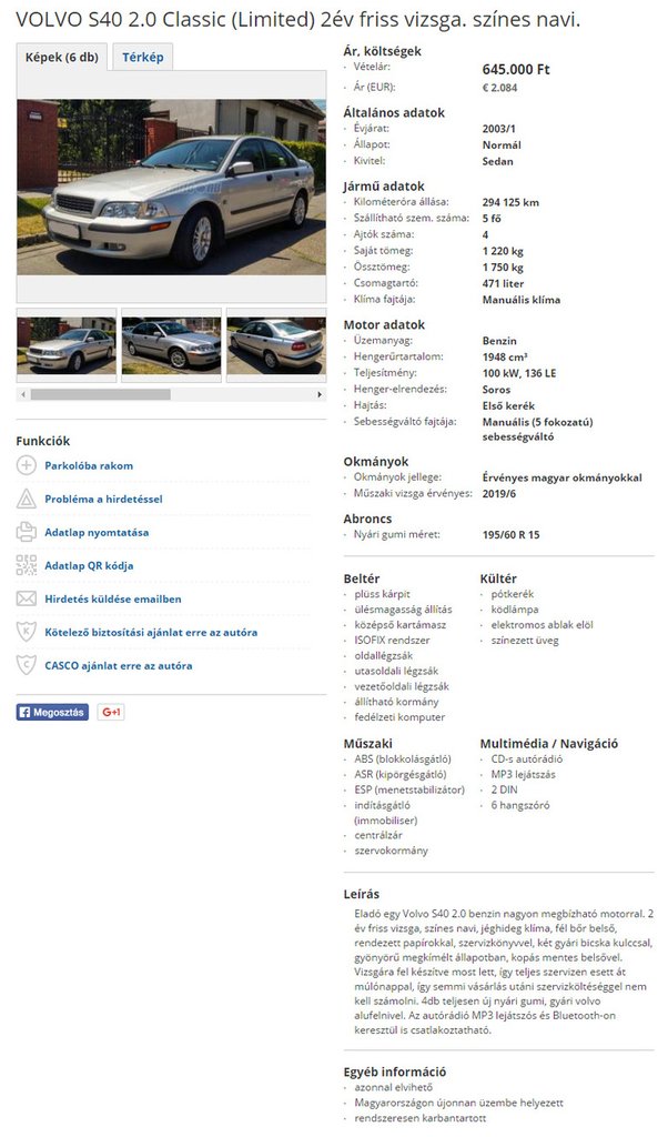 A széthajtott, roncstelep-pozitív Volvo S40 esetében több mint száz százalékos haszonkulccsal dolgozott a csaló, aki nyár elején 640 ezer forintért hirdette meg a tavasszal 270-ért eladott autót. Két év műszaki vizsga, négy új gumi és gyári alufelnik, illetve a műszaki vizsgára felkészítés kapcsán elvégzett teljes szerviz - ilyeneket olvasok a lementett hirdetésben, amellyel június végén ismét felkerült a Volvo a Használtautó.hu-ra.