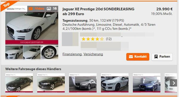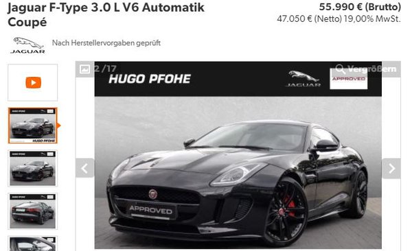 Olyan autót kell választaniuk, amelyet Mehrwertsteuer auswiesbar jelöléssel kínálnak a kinti hirdetési oldalakon. Tegnap délelőtt felütöttem a mobilét és az oldal véletlenül nem az Audi-BMW-Mercedes triász egy tagjánál nyílt ki, hanem a Jaguar-hirdetéseknél. A részletes keresés menüpontban alámerülve kiválasztottam az MwSt. auswiesbar opciót, így a rendszer 3497 találatra szűkített a korábbi 7499-ről. Még ez is elég durva szám, vagyis az áfa nélküli autók kínálata döbbenetesen nagy.