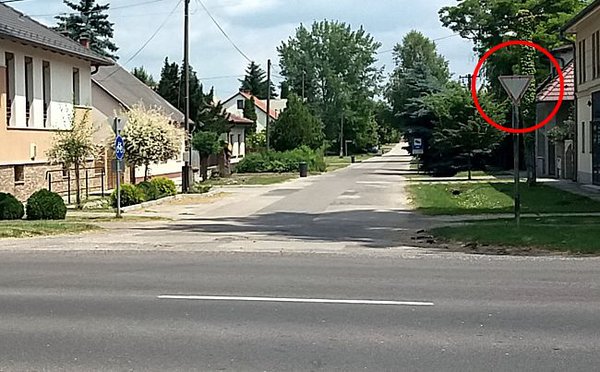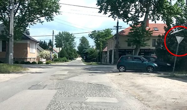 A közút kezelője, ha áttételesen is, de elismerte felelősségét: a baleset után pár héttel pótoltak egy elsőbbségadás kötelező táblát - az alábbi képen is jól látható -, amely egyébként minden további kereszteződésben a helyén van, de innen hiányzott, amikor a teherautó elgázolta a kislányt.