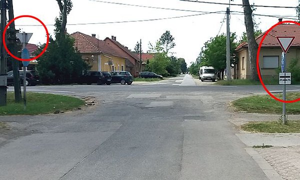 Az 5-ös út és Irinyi utca találkozásánál lévő kereszteződés esetén az „Elsőbbségadás kötelező” tábla az alárendelt utak felől érkezők számára a gyalogos járdák előtt látható.