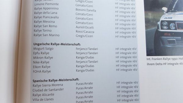 Az ember akár már bele is fáradhatott a gyakori látványba, hiszen ekkor már három éve minden a Lancia Delta HF-ről szólt a raliban. Ferjáncz és Ranga pedig gondoskodott róla, hogy a hazai hírekben is állandó szó essen az olasz kisautóból épített szörnyről. Jójójó, ne vegyük el a rivaldafényt a kor többi nagyszerű masinájáról sem, hiszen a Toyota Celica GT-4/Turbo 4WD, a Mitsubishi Galant VR-4, a Peugeot 205/309GTi, a Ford Sierra XR4x4/RS Cosworth, a Mazda 323 4WD/GT-X, az Audi 200/90 quattro, a Renault R5/R11 Turbo - és még sokan a listában - felettébb izgalmassá tették az akkor még hatalmas tömegek jelenlétében rendezett versenyeket.