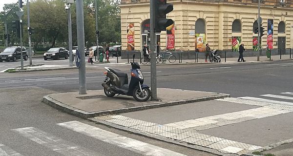 Ugyanakkor itt, ezen a helyen a moped nem járdán, hanem járdaszigeten áll.