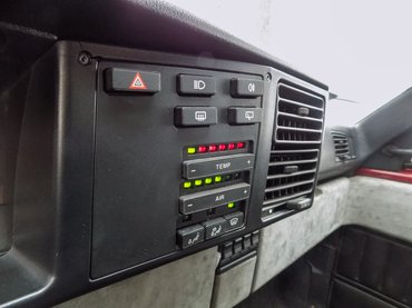 A kockaműszerfalon kockagombok, nincsenek csúszkák, sem tekerőgombok. Led viszont van bőséggel, de ez nem annyira meglepő, hisz semmi nem volt annál menőbb akkoriban. Ledsorokon követhetjük a fűtés erősségét, ahogyan a ventilátor fokozatát is. Sehol nem érzünk feszülő bovdeneket a gombok mögött, nagyon finoman működik az összes kapcsoló, fura ez egy 32 éves kisautóban. De finoman helyreteszi az embert a pillanat, amikor megpillantja a sokszor összehajtott kis papírt, ami a rádió ajtaját tartja a helyén.
