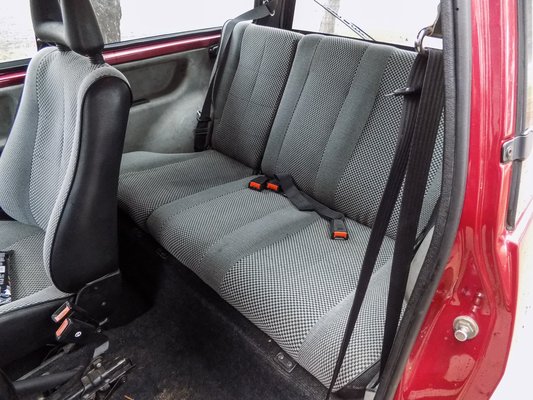 A kizárólag háromajtós kivitelben gyártott autó ajtaját kinyitva rögtön megállapíthatjuk, hogy van előnye a papírkaszninak, hiszen belül nagyon jó a helykínálat. Hátul is el lehet férni úgy ahogy, bár inkább csak azért próbáltuk ezt ki, hogy láthassuk, miként ugrik előre az első ülés. Nem szimplán dől a támla, nem is sínen csúszik előre, hanem az egész ülés elemelkedik és lép egyet. Amikor erre rájöttem, már éreztem, hogy ez csak egy a további, nem hétköznapi megoldások sorában, de többek közt ezeket imádom a régi olasz autókban.