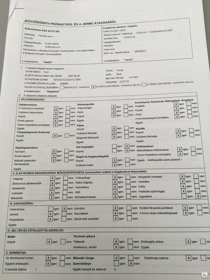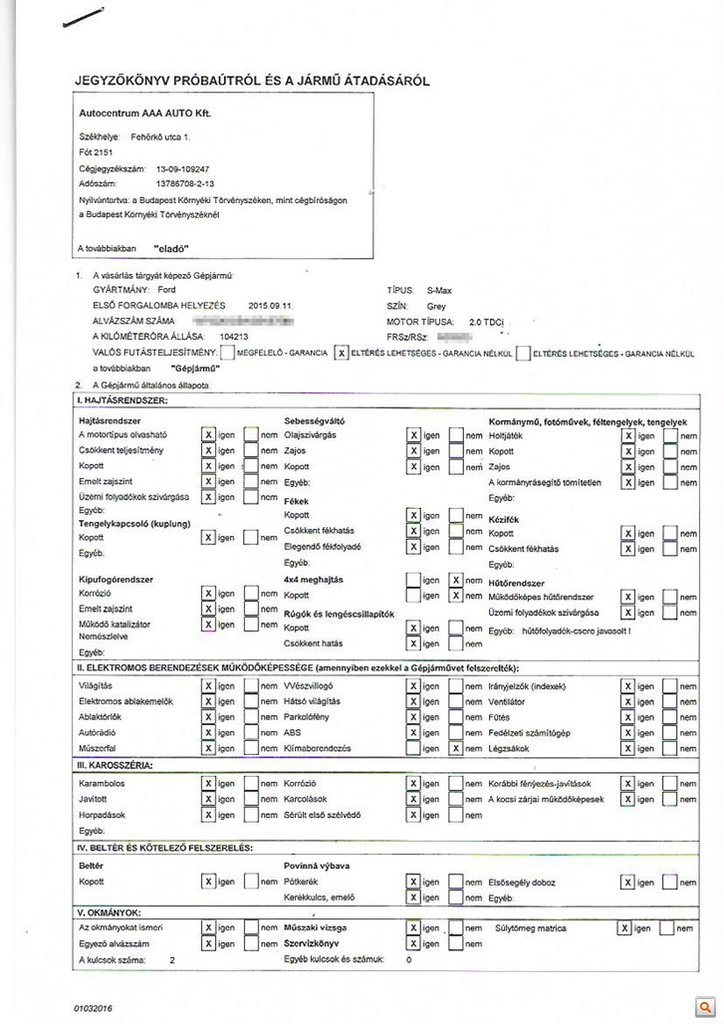 Az ügyintézők dicsérték az autót, így ő sem gyanakodott, és fizetett. Formaságnak tekintette a papírmunkát, ahogy Gabriella is, így ő sem volt elég éber, amikor az adásvételi szerződésből és a biztosításkötéshez tartozó dokumentumokból álló irathalom részeként aláírta a Jegyzőkönyv próbaútról és a jármű átadásáról című háromoldalas iratot, melyet a továbbiakban állapotlapnak és jegyzőkönyvnek is nevezek majd. Képként és letölthető formában is megmutatjuk a teljes jegyzőkönyvet, és jó szívvel ajánlom, hogy aki teheti, tanulmányozza át. (A jegyzőkönyv oldalai teljes méretben: első, második, harmadik.)