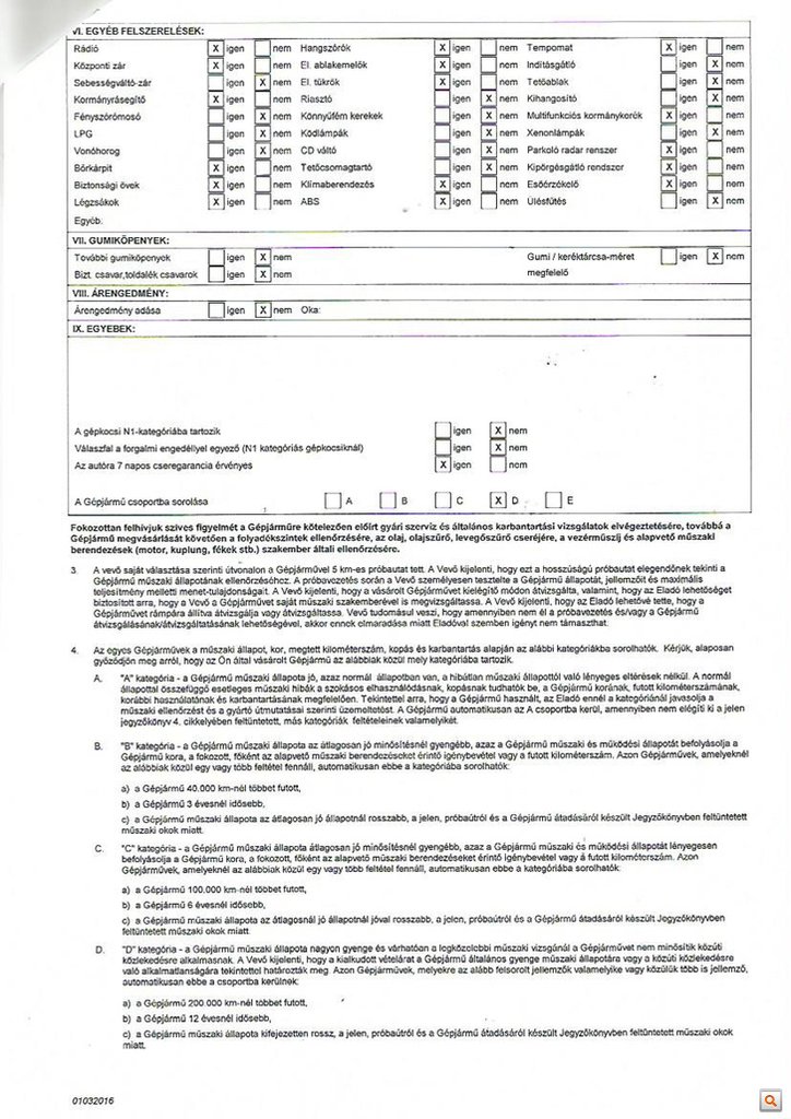Ez eddig éppen olyan, mint egy nagyon korrekt állapotértékelő lap, csakhogy amikor pontról-pontra tanulmányozzuk az apró betűvel szedett jegyzéket, kiderül, hogy az első oldalon lévő részletes állapotértékelő táblázatban szereplő Igen válaszok valójában az autón az eladó által megjelölt részletes hibákra (például korrózió, csökkent fékhatás vagy emelt zajszint) utalnak, a másodikon viszont arra, hogy minden rendben van, esetleg megvan.