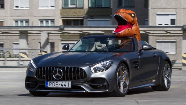 Ha pedig nem lenne feltétel, hogy saját kép legyen, nem is jöhetne szóba más, mint amikor az AMG GT-C Roadstert vezetem T-Rex-jelmezben. Anti feldobta a labdát: ha már úgyis itt az autó, nyitható a teteje, neki meg akad egy ilyen maskarája, akkor adja magát a feladat. Nem kellett sokáig győzködnie. Szürreális élmény egy ilyen autót vezetni, de még hihetetlenebb így.