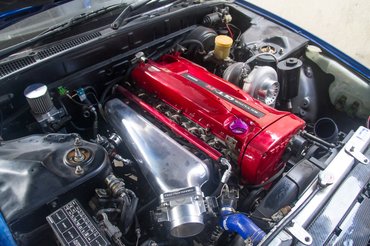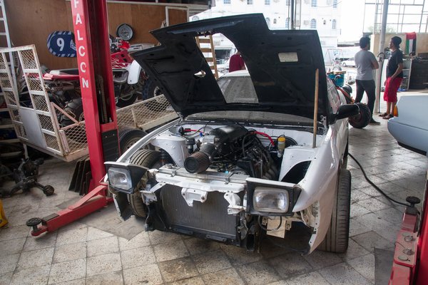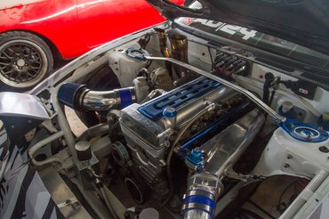 Rafet szerint jó vásár még az amerikai V8, olcsón tudnak viszonylag nagy teljesítményt. Egy másik sarokban, egy 180SX-ben például egy 6,2 literes Chevy LS motor van, szívóként több mint 600 lóerős. Szeretik, mert a könnyűfém blokk alig nehezebb, mint egy acél négyhengeres turbó, ráadásul kompakt: a nyomórudas felépítés miatt nagyon kicsik a hengerfejek, még egy iratmegsemmisítőbe is be lehetne rakni.