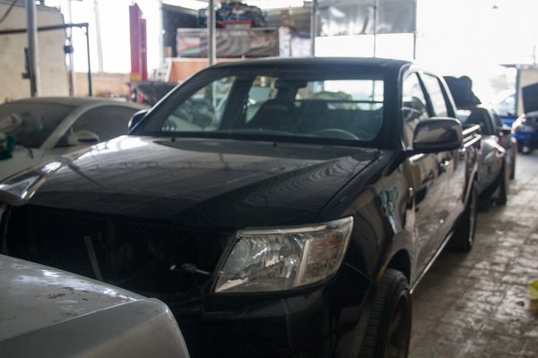 Előtte egy Hilux pickupot dobtak le a félhomályban, ez ügyfélautó. A platóra épített biztonsági tank vészjóslóbb, mint egy milícia gépágyúja, a bukócsővel bélelt beltér is sokat sejtet. 1250 lóerős, szintén 2JZ-vel, de itt 3,5 literesre fúrva. A motort jobban is meg lehet nézni, ugyanis nem messze az autótól hever, sajnos épp hengerfejes. Biztos nincs hozzá köze annak, hogy a gyári teljesítmény négyszeresét adja le.