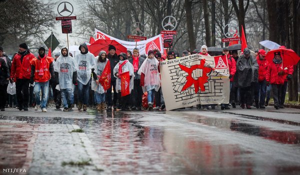 A Mercedes Benz hamburgi gyárának dolgozói transzparensekkel vonulnak az IG Metall német fémipari szakszervezet által meghirdetett figyelmeztető munkabeszüntetésen Brémában 2018. január 18-án, a fémipari szakszervezeteknek és a szektor munkadóinak az északi nagyvárosban tartott bértárgyalásai idején. (MTI)
