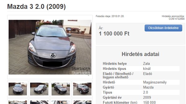 Amikor egy autóhirdetésben szereplő telefonszám nem kapcsolható, nem fog gyanút azonnal az ember. Lehet egyszerű elírás is. Én sem gyanakodnék azoknak a helyében, akik a napokban megtalálták ennek a 2009-es Mazda 3-nak a hirdetését a Startapró nevű hirdetési oldalon. A képeken gondosan kitakarták a rendszámot, de az autó kifejezetten szép, sok extrával felszerelt, megkímélt állapotú, ahogy a szövegben írják.