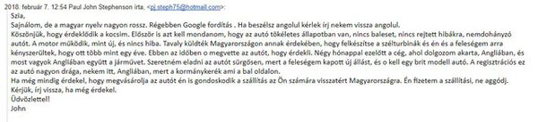 A második körben már angolul írt levelet kapnak az érdeklődők és a mese is ugyanaz. A tulajdonos eddig Magyarországon dolgozott, de visszaköltözött Manchesterbe, az autót a felesége használta korábban, de kint a baloldalon lévő kormány miatt már nem felel meg neki, ezért adják el és ezért ilyen olcsón. A hirdetés feladója egy bizonyos Paul John Stephenson, akiről sajnos korábban azt írtam, hogy kitalált karakter és/vagy csaló.
