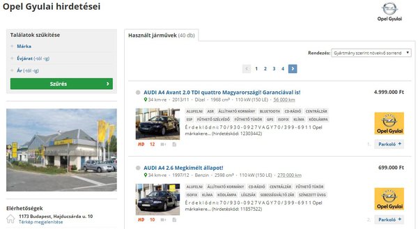A 2012-es autót az Opel Gyulai márkakereskedés nevében hirdette a cég használt autós alvállalkozása, a Tazo Car 2003 Kft. Apró részlet ez, de Eszter és párja szerint fontos, mert benne bizalmat ébresztett, hogy a Használtautó.hu-n a márkakereskedés épületét ábrázoló fotókkal hirdet a kereskedés, de főként az, amit a Superb hirdetésében írtak: kitűnő állapotú és leinformálható előéletű gépkocsi.