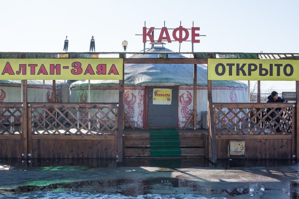 Talán azért is, mert a városban még nincsenek modern plázák, inkább olyasféle szolgáltatóházak vannak, mint nálunk húsz éve, mondjuk a Flórián. Csak boltok, boltok és boltok, még kávézó se nagyon. A Szelenga partján van egy különösen nagy hodály, de abban is csak ronda farmerok, kötött sapkák, kesztyűk, és az új divat, a műbőr baseballsapka. Az árusok nem kínaiak, amit furcsállok, hiszen ide már mind Mongólia, mind Kína viszonylag közel van. Lényeg, hogy kajálni idebent sem lehetett, kint viszont több jurta is áll. Nem szeretem, ha be sem tudok lesni valahová, pedig én aztán tényleg bármit megeszek.